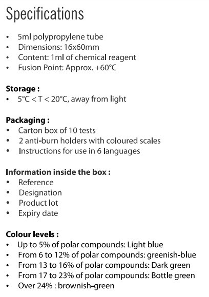 - สีเขียวอมน้ำตาล : ตั้งแต่ 24% ของสารประกอบเชิงขั้วขึ้นไป