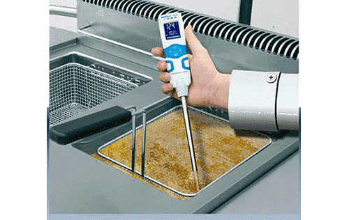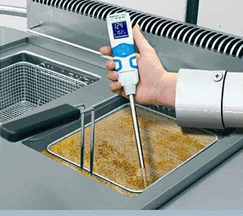 - นำเครื่องวัดน้ำมันทอดจุ่มลงไปในน้ำมันพืชที่ผ่านการทอดแล้ว แล้วบันทึกผล